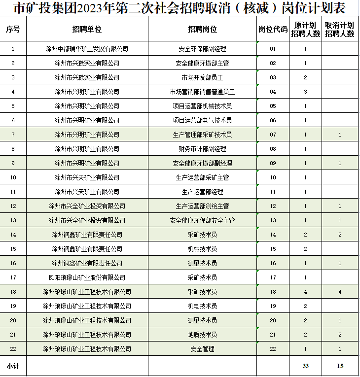 根據《滁州市興滁礦業(yè)投資集團有限公司2023年第二次社會招聘公告》規(guī)定,經對各崗位報名情況篩查審定,結合資格復審情況,部分崗位報名情況未達到開考比例,經研究決定取消以下崗位招聘計劃: