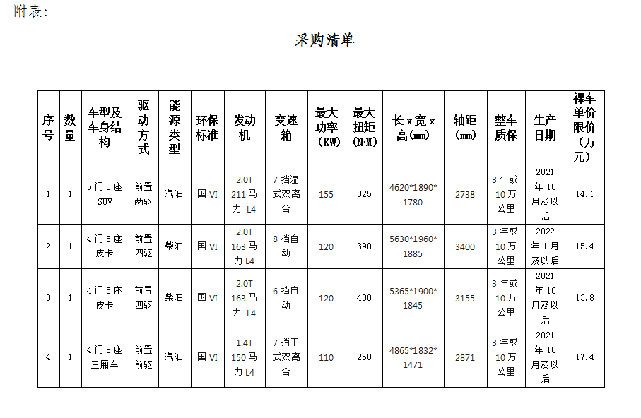 1.根據業(yè)務發(fā)展需要,滁州市興元商貿有限公司擬集中采購業(yè)務保障車輛共計4輛,詳情見附表。